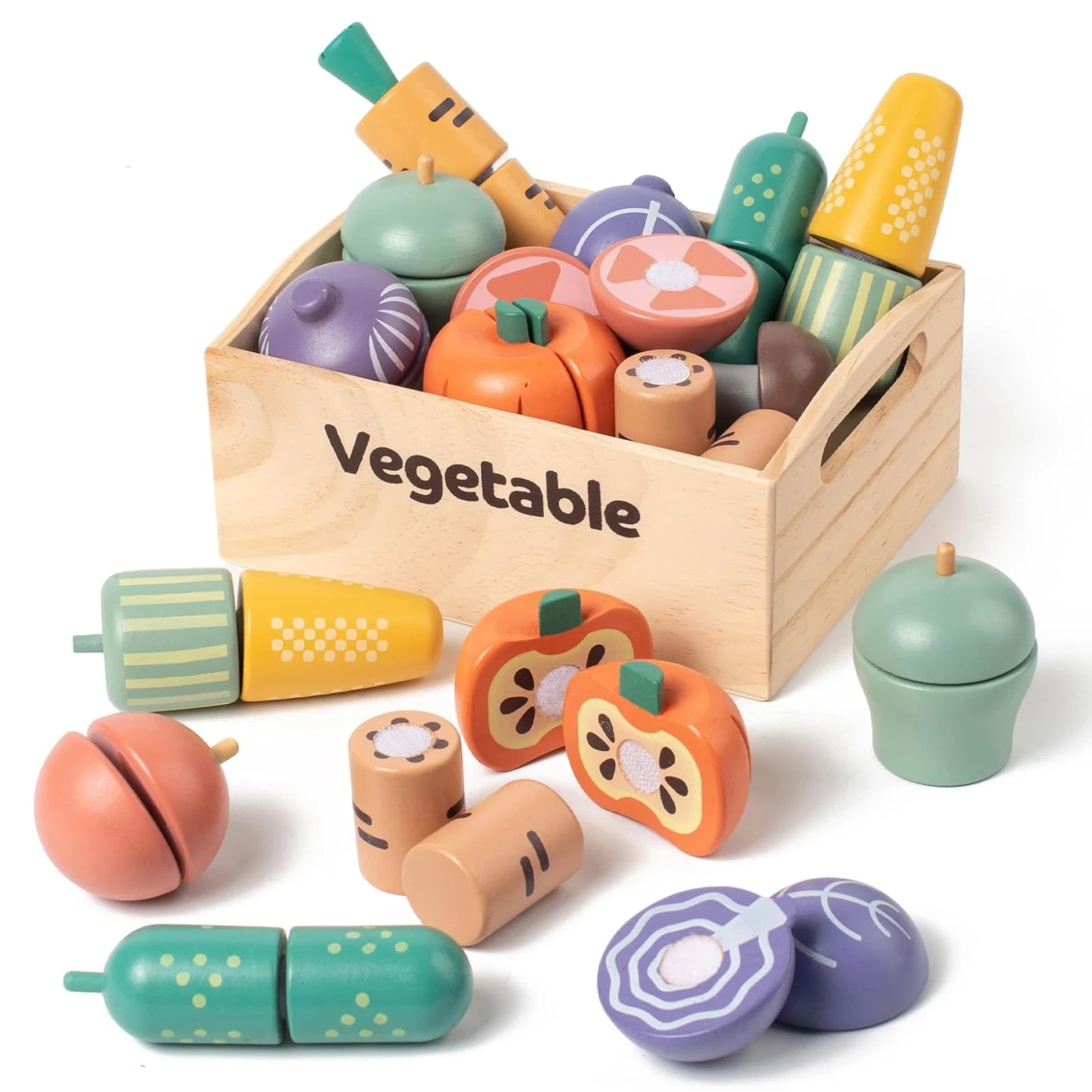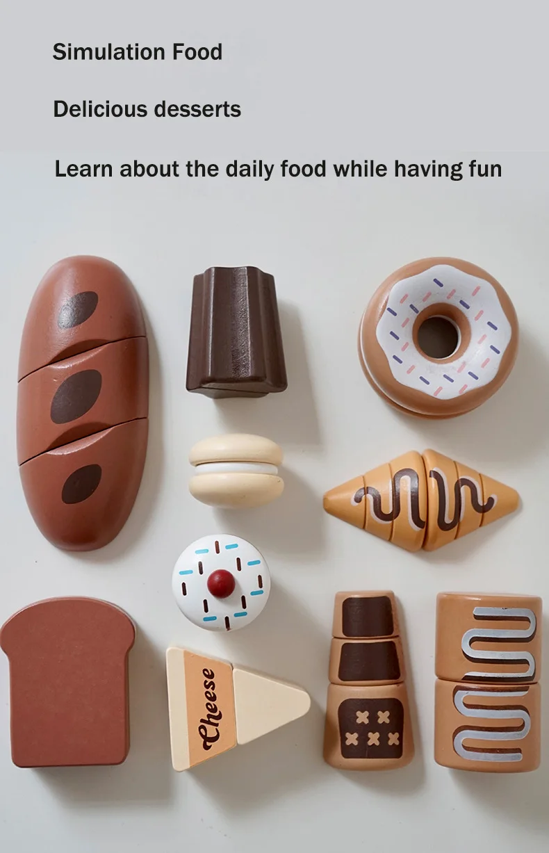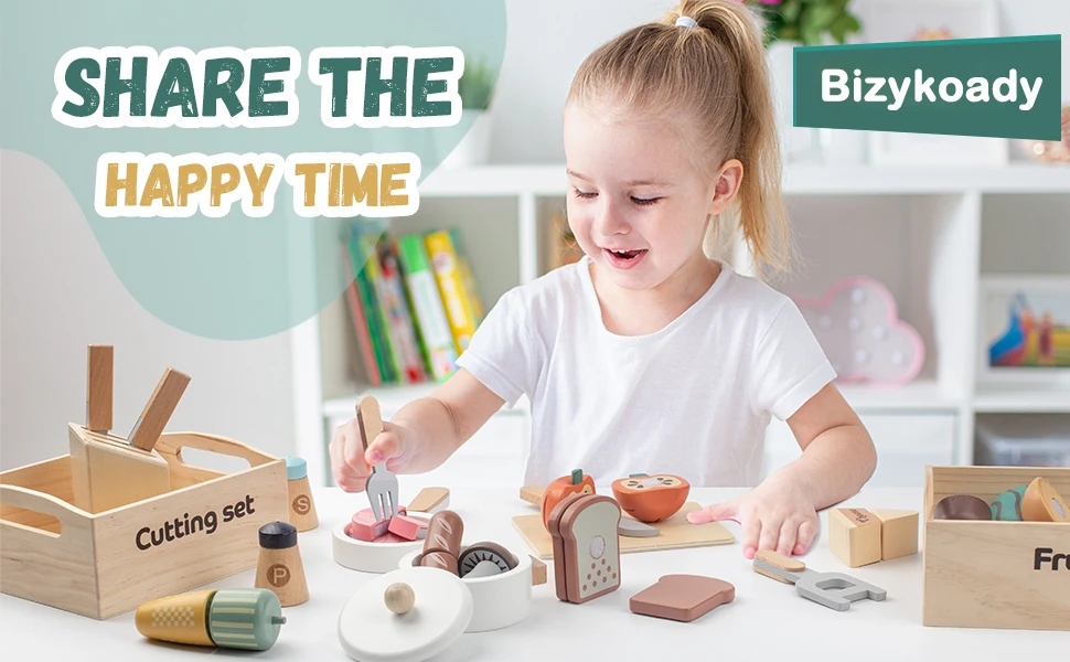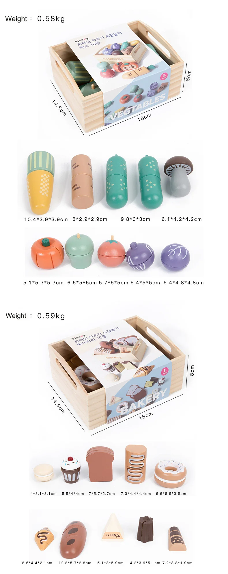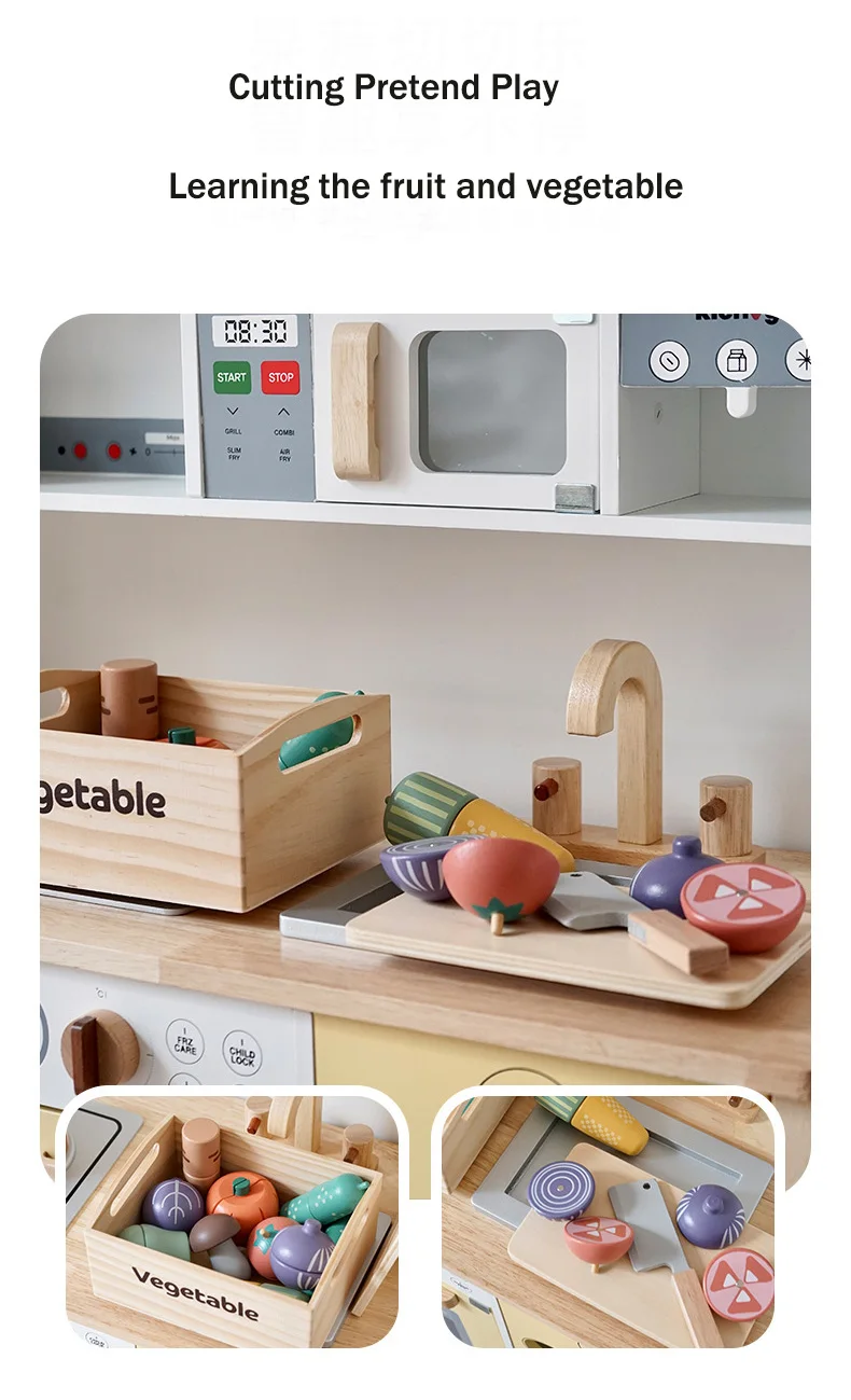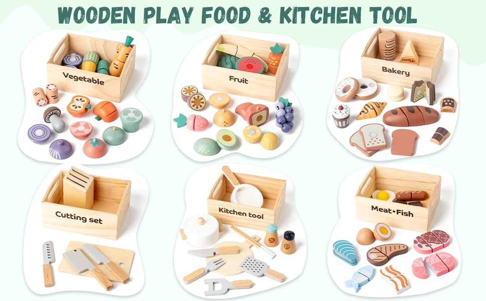 • Includes: Wooden fruits, vegetables, desserts, kitchen utensils, tray, and tableware